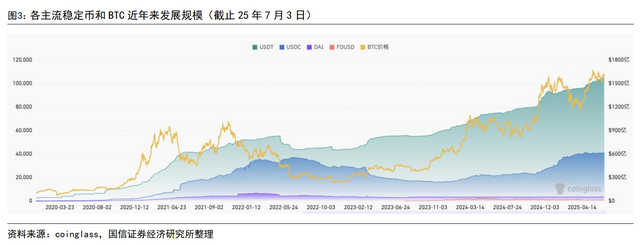 在加密货币时代,稳定币规模伴随 BTC 等呈现一定波动,头部稳定币先发优势明显。从诞生至今,加密货币交易一直是稳定币的主要应用场景之一,尤其是早期伴随着 BTC 等加密货币市场牛熊,稳定币的需求量呈现一定波动。随着BTC从2020年 1 万美元左右价格,涨到如今近 11 万美元价格,整个稳定币也从2020年刚突破 100 亿级规模,达到现在的超 2500 亿美元规模。