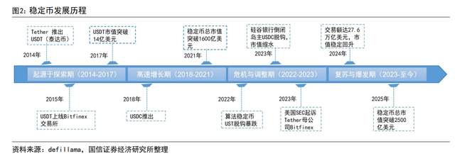 稳定币诞生于加密货币市场,当前处于快速发展阶段。随着比特币等加密货币诞生,其价格的剧烈波动带来了稳定币的需求,稳定币与法币1:1 挂钩,实现了现实世界价值和数字货币世界价值的链接。2014 年,Tether 率先推出首个稳定币USDT,锚定美元 1:1。2018 年 Circle 与 Coinbase 推出USDC,以高透明度和合规性(每月审计报告)赢得更广泛的信任。2022-2023 年,硅谷银行暴雷等事件也导致了稳定币市场规模缩水。2023 年下半年开始,加密货币市场回暖,以及合规化推动了稳定币规模继续增长,2025 年稳定币总市值突破2500 亿美元。随着当前各国推出稳定币相关法案,稳定币有望继续保持高增长节奏。