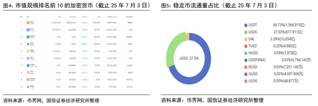 两大稳定币已稳居加密货币市值前十,后排稳定币已难超越。截止2025年7月3日,在加密货币市场中,BTC 依然一家独大,市值超过21700 亿美元;ETH市值约3100 亿美元,排名第二;稳定币 USDT 市值约 1567 亿美元,也是第三大数字货币。在稳定币中,USDT 份额为 69.73%,排名第一;USDC 市值约618 亿美元,份额27.50%。其余稳定币份额均规模较小,已很难对前两名构成威胁。