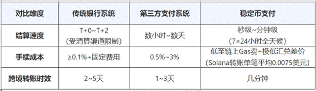 相较于传统银行和第三方支付,稳定币在结算速度、成本控制和全天候可用性上具有显著优势,具体对比可见下表: